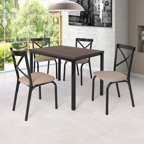Este tipo de material é muito superior que os acabamentos em Pintura UV (que acaba sendo o tipo mais utilizado na fabricação dos móveis). Medida da Mesa (A x L x P): 78cm x 72cm x 110cm Peso da Mesa: 16,02 kg Mesa suporta até: 100 kg Acabamento da Cadeira/Banco: Pintura Epóxi Acabamento da Mesa: Pintura Epóxi Acompanha Manual de Instalação: Sim Almofada do assento: Removível Almofada do encosto: Não Possui Altura do Conjunto: 78 cm Ambiente Principal: Cozinha Cadeira/Banco estofada: Somente Assento Estofado Cadeira/Banco suporta até: 100 kg Complexidade da Montagem: Baixa: pode ser montado por uma pessoa sozinha Cor: Preto Fosco/Linho Bege/Amendoa Cor da Base: Preto Cor do Produto: Preto Fosco/Linho Bege/Amendoa Cor do Tampo: Marrom Cor Secundária: Bege De Canto (Canto Alemão): Não Design da Base: 4 Pés Escala de Brilho: Fosco Espessura do Tampo: 30 mm Estrutura do Assento: Madeira/Espuma/Sintético Estrutura do Encosto: Aço Formato do Tampo: Retangular Itens Inclusos: 1 Base de Mesa, 4 Cadeiras, 1 Tampo de Madeira, Kits de Parafusos e manual de montagem Linha ou Coleção: Karina Manual de Montagem e Instalação: https://product-hub-prd.madeiramadeira.com.br/910659/documents/db02a363-4b5e-40fd-a618-a13dae916ccd198519160017168350060866.pdf Material da Base da Mesa: Aço Carbono Material da Estrutura da Cadeira: Aço Carbono Material do Tampo: BP Material Principal: Aço Carbono Material Principal das Cadeiras/Bancos: Aço Carbono Medida da Cadeira/Banco (A x L x P): 90cm x 50cm x 53cm Medida do Tampo (L x C x E): 72cm x 110cm x 3cm Mesa Dobrável: Não Mesa Extensível: Não Necessita Montagem: Sim Origem do Produto: Nacional Peso da Cadeira/Banco: 4,25 kg Possui Apoio para Braços: Não Possui Apoio Para os Pés: Não Possui Prateleiras: Não Possui Rodízio: Não Possui Suporte Giratório: Não Possui Vidro: Não Quantidade de Cadeiras: 4 Quantidade de Lugares: 04 Recomendações de Uso, Manutenção e Limpeza: Não utilizar produtos quimicos na limpeza, nâo expor a chuva, nâo reclinar, nâo pisar Sistema de Montagem: Parafusos Tipo de Assento: Removível Tipo de Encosto: Fixo