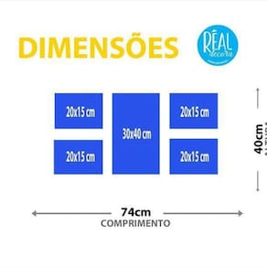 Esta composição possui 5 quadros, sendo eles nos seguintes. Tamanhos: 1 quadro 30x40 cm (30 cm de largura e 40 cm de altura) 4 quadros 20x15 cm (20 cm de largura e 15 cm de altura)