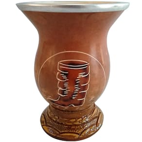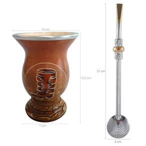 Este conjunto para chimarrão acompanha cuia e bomba é perfeito para desfrutar do seu mate diariamente. A cuia em formato de porongo tradicional, com pé confeccionado em resina epóxi que possibilita a colocação sobre superfícies planas. É uma cuia de tamanho médio com desenhos típicos gaúchos entalhados no corpo do porongo e bocal de alumínio. A tradição do seu chimarrão com uma tradicional cuia gaúcha!