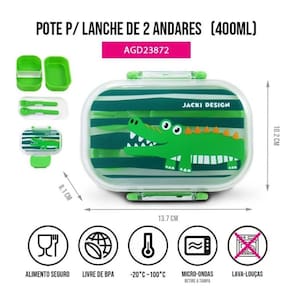 A hora do lanche ficou muito mais divertida com o pote para lanche de 2 andares da coleção PIMPOLHOS. Com capacidade para 400ml, possui divisórias na parte inferior para facilitar a separação dos alimentos e uma bandeja com encaixe para os talheres que acompanham o kit; e tampa com fechamento em travas de segurança. É perfeito para passeios, viagens e escolinha. Produto livre de BPA e com qualidade Jacki Design. Conheça a linha completa da coleção PIMPOLHOS e complete o seu kit! (INSTRUÇÕES DE USO: Retire a tampa antes de levar ao micro-ondas; usar somente para aquecer comida, não para cozinhar; Vai ao freezer e lava-louças; Temperatura de uso: -20C ~100C; Limpe usando uma esponja macia e detergente neutro.
