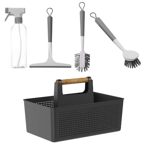 Garanta já o seu Conjunto de Lavanderia Completa Flow com Borrifador, Rodo, Escova, Escova Arredondada e Cesto Multiuso!