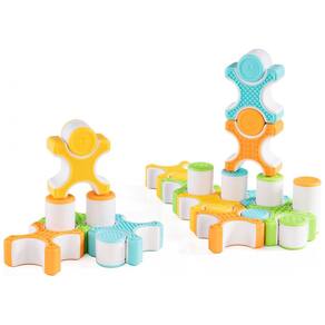 As peças possuem estrutura metálica interna com revestimento em plástico macio sobremoldado, oferecendo boa pegada para mãos pequenas e uma experiência sensorial segura. Alguns cilindros apresentam rostos expressivos e símbolos matemáticos simples, estimulando brincadeiras de faz de conta e desenvolvimento socioemocional em conjunto com as atividades de montagem. O conjunto é indicado para uso em casa e em ambientes educacionais, com peças de fácil limpeza para rotinas de higienização frequente.?