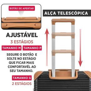 Conjunto Mala Viagem Santino Krabi Pequena, Média e Grande Cor: Preto Conjunto de Malas Krabi 3 Peças Rígida 360 Santino Viajar com praticidade e estilo ficou ainda mais fácil com a linha Krabi Santino. Produzidas em ABS de alta qualidade com detalhes em material sintético elegante, as malas oferecem resistência, durabilidade e um design moderno que se destaca em qualquer viagem. O conjunto conta com três tamanhos diferentes P, M e G para atender todas as suas necessidades, desde viagens rápidas até longos trajetos. Todas possuem rodas com giro 360, que garantem mobilidade leve e silenciosa, além de alça telescópica regulável e acabamento emborrachado para maior conforto no manuseio. Segurança reforçada: Mala pequena com fechadura numérica integrada. Malas média e grande com cadeado TSA, alça lateral, base de apoio e sistema expansível de até 20% mais espaço. Organização interna completa: Forro em tecido de alta qualidade Bolso divisor com zíper Bolso telado Elásticos de fixação com trava Dimensões e capacidades: Pequena 22 : 57x36x24cm Peso 2,83kg Até 10kg Média 24 : 66x45x27cm Peso 3,69kg Até 23kg Grande 28 : 76x52x30cm 105cm com carrinho Peso 4,45kg Até 30kg Ideal para quem busca um conjunto resistente, espaçoso e sofisticado com ótimo custo-benefício, o Conjunto de Malas Krabi Santino é a escolha certa para transformar sua experiência de viagem.