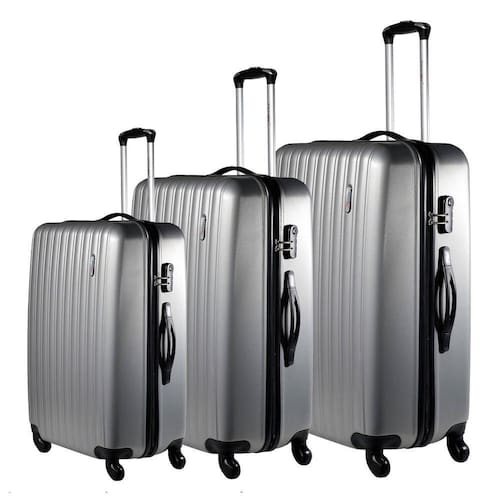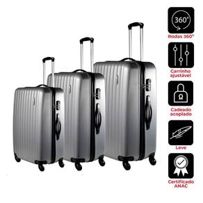Disponível nos tamanhos P, M e G e na cor prata, o Conjunto de Malas Londres contém 4 rodas, carrinho embutido, alça superior e lateral nos tamanhos M e G, textura microdiamante e fechadura segura.