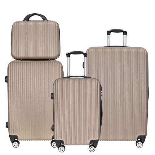O conjunto conta com quatro peças, sendo uma Mala Bordo de 20”, uma Mala Média de 24”, uma Mala Grande de 28”, e uma Frasqueira de 15”. Todas na cor Dourada, são a escolha perfeita para acompanhar você em suas aventuras, viagens longas, em família ou viagens internacionais.