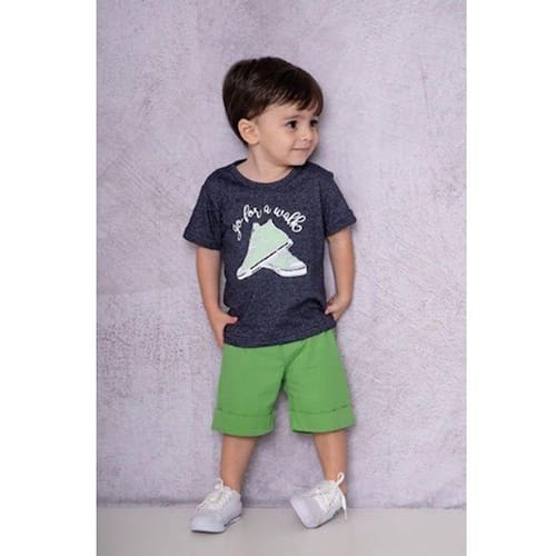 Conjunto camiseta manga curta com estampa tênis, bermuda sarja com bolso traseiro Passagem Secreta