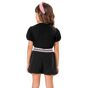 Conjunto infantil preto com ursinha look festa passeio é a escolha perfeita para meninas estilosas que adoram conforto e delicadeza no dia a dia ou ocasiões especiais. Composto por blusa de mangas bufantes e estampa de ursinha com laço rosa, além de um short saia com bolsos frontais aplicados e elástico listrado na cintura, esse conjunto é moderno, charmoso e super prático.
