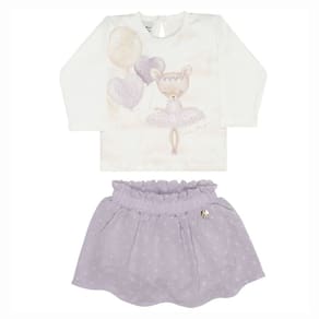 Conjunto Infantil Menina Blusa Manga Longa Off White + Short Saia Bailarina 2Pçs Lilás - Sonho Mágico: Charme e Conforto para a sua Princesa