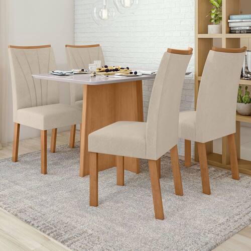 Combina com a decoração para sala de estar? Claro, fica perfeita na decoração para sala de jantar e outros ambientes. Medida da Mesa (A x L x P): 78cmx120cmx80cm Peso da Mesa: 28,9 kg Mesa suporta até: 40 kg Acabamento da Cadeira/Banco: Pintura Acabamento da Mesa: Pintura UV Acompanha Manual de Instalação: Sim Almofada do assento: Fixa Ambiente Principal: Sala de Jantar Cadeira/Banco Estofada: Encosto e Assento Estofados Cadeira/Banco estofada: Encosto e Assento Estofados Cadeira/Banco suporta até: 120 kg codigo_ean: 7909903730126 Complexidade da Montagem: Média: pode ser montado por mais de uma pessoa e/ou necessite de maior conhecimento para montagem Configuração do Conjunto: Mesa com Cadeiras Cor: Amêndoa Clean/Off White/ Naturale Creme Cor da Base: Marrom Cor das Cadeiras: Bege Cor do Produto: Amêndoa Clean/Off White/ Naturale Creme Cor do Tampo: Bege Cor Secundária: Marrom De Canto (Canto Alemão): Não Design da Base: Em X Enchimento do Assento: Espuma D-20 Escala de Brilho: Fosco Espessura do Tampo: 18 mm Estrutura do Encosto: MDF Formato do Tampo: Retangular Itens Inclusos: 1 Mesa com 4 Cadeiras, Ferragens e Manual de montagem Linha ou Coleção: Celebrare Manual de Montagem e Instalação: https://product-hub-prd.madeiramadeira.com.br/912585/documents/39f60fc9-7f17-4689-acca-2708f7ac23ec2473CELEBRARE20COM20APOGEU.pdf Marca: Móveis Lopas Material da Base da Mesa: MDF/MDP Material da Estrutura da Cadeira: MDF Material do Tampo: MDF Material Principal: MDF/MDP Material Principal das Cadeiras/Bancos: MDF Medida da Cadeira/Banco (A x L x P): 97cmx42cmx59cm Medida do Tampo (L x C x E): 90cmx90cmx18mm Mesa Dobrável: Não Mesa Extensível: Não Necessita Montagem: Sim Origem do Produto: Nacional Peso da Cadeira/Banco: 9,3 kg Possui Apoio para Braços: Não Possui Apoio Para os Pés: Não Possui Prateleiras: Não Possui Suporte Giratório: Não Possui Vidro: Sim Quantidade de Cadeiras: 4 Quantidade de Lugares: 04 Recomendações de Uso, Manutenção e Limpeza: Limpar com flanela limpa e seca. Não usar produtos abrasivos. Revestimento da Cadeira/Banco: Veludo Sistema de Montagem: Parafusos Tipo de Assento: Fixo Tipo de Encosto: Fixo