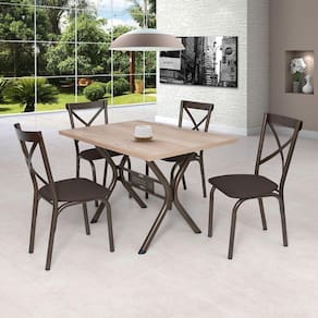 O conjunto de mesa Karina, é o conjunto ideal para sua cozinha, na cor Bronze e com tampo de BP Amendoa de 1,20m x 0,80m, possui 4 cadeiras com design moderno e anatômico, estofado em courino sintético de fácil limpeza. Tampo de MDP BP: produzido a partir de chapas de madeira industrial de média densidade com revestimento de laminado plástico prensado e fundido nas duas faces através de altas temperaturas e baixa pressão (daí o nome/abreviatura de BP – baixa pressão). Comparativo com outros materiais: Este tipo de material é muito superior que os acabamentos em Pintura UV (que acaba sendo o tipo mais utilizado na fabricação dos móveis). Portanto, os móveis de MDP BP são a melhor escolha para uso em áreas mais úmidas e que exigem maior resistência (ideal para a cozinha ou a lavanderia). Acabamento da Cadeira/Banco: Pintura Epóxi Acabamento da Mesa: Pintura Epóxi Almofada do assento: Removível Altura do Conjunto: Ambiente Principal: Cozinha Apoio para Braços Estofado: Cadeira/Banco estofada: Sim Cadeira/Banco suporta até: 100 Complexidade da Montagem: Baixa: pode ser montado por uma pessoa sozinha Cor: Bronze/Linho Marrom Cor do Produto: Bronze/Linho Marrom Enchimento do Assento: Espuma D-20 Enchimento do Encosto: Escala de Brilho: Fosco Espessura do Tampo: 30 Estrutura do Assento: Madeira Estrutura do Encosto: Informações Complementares: Tampo de MDP BP, Resistente a riscos e umidade, proporciona maior resistência e durabilidade Itens Inclusos: 1 Mesa, 4 Cadeiras, Kit Ferragens e Manual de Montagem Linha ou Coleção: Classica Manual de Especificação Técnica: Manual de Montagem e Instalação: https://cdn2.madeiramadeira.com.br/atributo/moveis-ciplafe/1012092-130022-folh-cad-276-out-2021.pdf Material da Base da Mesa: Aço Material da Estrutura da Cadeira: Aço Medida da Base (A x L x P): Medida da Cadeira/Banco (A x L x P): 90cm X 50cm X 53cm Medida da Mesa (A x L x P): 74cm X 59cm X 75cm Medida do Canto Alemão (A x L x P): Medida do Suporte Giratório (L x C x E): Medida do Tampo (L x C x E): 80cm X 120cm X 30cm Mesa suporta até: 10 Necessita Montagem: Sim Origem do Produto: Nacional Peso da Cadeira/Banco: 4.25 Peso da Mesa: 4.81 Possui Apoio para Braços: Possui Apoio Para os Pés: Não Possui Suporte Giratório: Recomendações de Uso, Manutenção e Limpeza: Limpar com pano levemente umedecido. Não usar produtos abrasivos que possam danificar a superfície do móvel. Revestimento da Cadeira/Banco: Couro Ecológico Sistema de Montagem: Parafuso Tipo de Madeira Maciça da Base da Mesa: Tipo de Madeira Maciça do Tampo: undefined: Vidro Temperado: