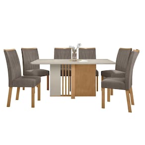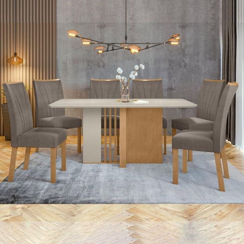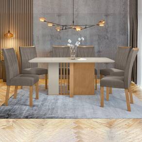 O conjunto de mesa Astrid com tampo de vidro e 6 cadeiras Apogeu é uma escolha elegante e funcional para sua sala de jantar. A mesa Astrid apresenta um design moderno e minimalista, com um tampo de vidro que adiciona um toque de sofisticação ao ambiente. Sua estrutura robusta garante estabilidade e durabilidade. As seis cadeiras Apogeu complementam perfeitamente a mesa. Com um design contemporâneo e estofamento confortável, oferecem tanto estilo quanto comodidade durante as refeições. Seu acabamento de alta qualidade e detalhes cuidadosamente elaborados conferem uma estética atraente ao conjunto. Medida da Mesa (A x L x P): 78cmx170cmx90cm Peso da Mesa: 71,58 kg Mesa suporta até: 40 kg Acabamento da Cadeira/Banco: Pintura Acabamento da Mesa: Pintura UV Acompanha Manual de Instalação: Sim Almofada do assento: Fixa Ambiente Principal: Sala de Jantar Cadeira/Banco estofada: Encosto e Assento Estofados Cadeira/Banco suporta até: 120 kg Complexidade da Montagem: Alta: deve ser montado por um montador especializado Cor: Amêndoa Clean/Off White/Bege Cor da Base: Marrom Cor do Produto: Amêndoa Clean/Off White/Bege Cor do Tampo: Bege Cor Secundária: Marrom De Canto (Canto Alemão): Não Design da Base: Retangular Enchimento do Assento: Espuma D-20 Enchimento do Encosto: Espuma D-18 Escala de Brilho: Fosco Espessura do Tampo: 29 mm Espessura do Vidro: mm Estrutura do Assento: MDF /MDP 25mm Estrutura do Encosto: MDF Formato do Tampo: Retangular Itens Inclusos: 1 Mesa com 6 Cadeiras, Kit Ferragens e Manual de montagem Linha ou Coleção: Astrid Manual de Montagem e Instalação: https://product-hub-prd.madeiramadeira.com.br/905988/documents/b83297c8-c98e-4571-9463-ae8fe39b4db5TRID20COM20CADEIRA20APOGEU.pdf Material da Base da Mesa: MDF/MDP Material da Estrutura da Cadeira: MDF Material do Tampo: Vidro/MDF Material Principal: MDF/MDP Material Principal das Cadeiras/Bancos: MDF Medida da Cadeira/Banco (A x L x P): 97cmx42cmx59cm Medida do Tampo (L x C x E): 170cmx90cmx29mm Mesa Dobrável: Não Mesa Extensível: Não Necessita Montagem: Sim Origem do Produto: Nacional Peso da Cadeira/Banco: 9,3 kg Possui Apoio para Braços: Não Possui Apoio Para os Pés: Não Possui Prateleiras: Não Possui Rodízio: Não Possui Suporte Giratório: Não Possui Vidro: Sim Quantidade de Cadeiras: 6 Quantidade de Lugares: 06 Recomendações de Uso, Manutenção e Limpeza: Limpar com flanela limpa e seca. Não usar produtos abrasivos. Revestimento da Cadeira/Banco: Suede Sistema de Montagem: Parafusos Tipo de Assento: Fixo Tipo de Encosto: Fixo