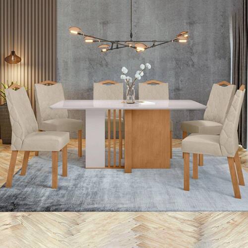 O conjunto de mesa Astrid com tampo de vidro e 6 cadeiras Venus é uma escolha elegante e funcional para sua sala de jantar. A mesa Astrid apresenta um design moderno e minimalista, com um tampo de vidro que adiciona um toque de sofisticação ao ambiente. Sua estrutura robusta garante estabilidade e durabilidade. As seis cadeiras Venus complementam perfeitamente a mesa. Com um design contemporâneo e estofamento confortável, oferecem tanto estilo quanto comodidade durante as refeições. Seu acabamento de alta qualidade e detalhes cuidadosamente elaborados conferem uma estética atraente ao conjunto. Medida da Mesa (A x L x P): 78cmx170cmx90cm Peso da Mesa: 71,58 kg Mesa suporta até: 60 kg Acabamento da Cadeira/Banco: Pintura Acabamento da Mesa: Pintura UV Acompanha Manual de Instalação: Sim Almofada do assento: Fixa Ambiente Principal: Sala de Jantar Cadeira/Banco estofada: Encosto e Assento Estofados Cadeira/Banco suporta até: 120 kg Complexidade da Montagem: Alta: deve ser montado por um montador especializado Cor: Amêndoa Clean/Off White/Creme Cor da Base: Marrom Cor do Produto: Amêndoa Clean/Off White/Creme Cor do Tampo: Bege Cor Secundária: Marrom De Canto (Canto Alemão): Não Design da Base: Retangular Enchimento do Assento: Espuma D-20 Enchimento do Encosto: Espuma D-18 Escala de Brilho: Fosco Espessura do Tampo: 29 mm Espessura do Vidro: mm Estrutura do Assento: MDF /MDP 25mm Estrutura do Encosto: MDF Formato do Tampo: Retangular Itens Inclusos: 1 Mesa com 6 Cadeiras, Kit Ferragens e Manual de montagem Linha ou Coleção: Astrid Manual de Montagem e Instalação: https://product-hub-prd.madeiramadeira.com.br/905991/documents/08abf523-b5c1-4b4e-9bfd-751641039ed512C7020COM20CADEIRA20VENUS.pdf Material da Base da Mesa: MDF/MDP Material da Estrutura da Cadeira: MDF Material do Tampo: Vidro/MDF Material Principal: MDF/MDP Material Principal das Cadeiras/Bancos: MDF Medida da Cadeira/Banco (A x L x P): 104cmx58cmx46,5cm Medida do Tampo (L x C x E): 170cmx90cmx29mm Mesa Dobrável: Não Mesa Extensível: Não Necessita Montagem: Sim Origem do Produto: Nacional Peso da Cadeira/Banco: 9,01 kg Possui Apoio para Braços: Não Possui Apoio Para os Pés: Não Possui Prateleiras: Não Possui Rodízio: Não Possui Suporte Giratório: Não Possui Vidro: Sim Quantidade de Cadeiras: 6 Quantidade de Lugares: 06 Recomendações de Uso, Manutenção e Limpeza: Limpar com flanela limpa e seca. Não usar produtos abrasivos. Revestimento da Cadeira/Banco: Veludo Sistema de Montagem: Parafusos Tipo de Assento: Fixo Tipo de Encosto: Fixo