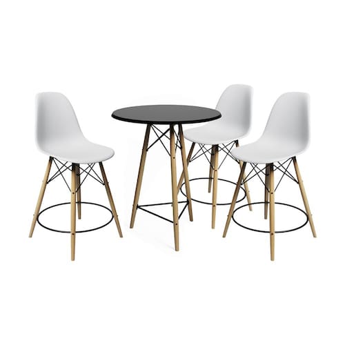 Conjunto mesa bistrô eames eiffel preta com 3 banquetas brancas de madeira O conjunto de mesa e banqueta eames eiffel bistrô possui um design moderno cheio de charme, fabricado com material de alta qualidade, proporcionando o melhor conforto e sem perder o estilo. A banqueta possui uma curvatura ergonômica que se encaixa perfeitamente ao corpo, ficando ainda mais completo com a mesa. Tipo: conjunto Modelo: bistrô Cor da mesa: preto Cor da banqueta: branco Características Produto nacional Base: madeira maciça Tampo da mesa: mdf Assento: plástico polipropileno Banqueta suporta: até 120kg Garantia: 90 dias Dimensões da banqueta Altura: 115cm Altura até o assento: 70cm Largura: 45cm Comprimento: 45cm Dimensões da mesa Altura: 97cm Diâmetro: 60cm Imagens meramente ilustrativas, podendo haver uma pequena variação na cor dependendo de cada tela ou monitor. Objetos da imagem ambientada não acompanham o produto. Ean: 7893565465413