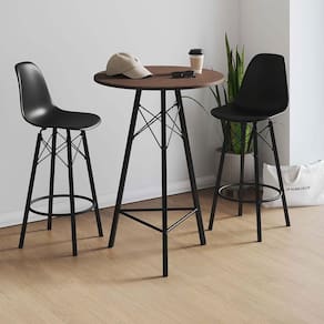 A Mesa Bistrô possui estrutura em ferro resistente e tampo redondo com acabamento refinado, garantindo estabilidade, facilidade de limpeza e um toque contemporâneo à decoração. As Banquetas Eames contam com estrutura em tubo de ferro e assento ergonômico, oferecendo firmeza e conforto mesmo em longos períodos de uso.
