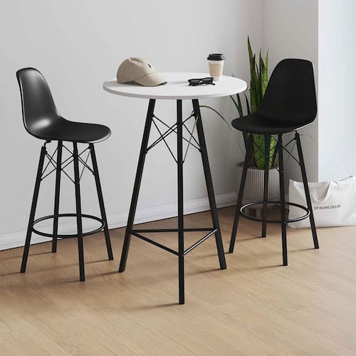 ATENÇÃO: As imagens são meramente ilustrativas e podem sofrer variações de cor e pequenos detalhes de acordo com o seu monitor, iluminação do ambiente e percepção visual.Conjunto Mesa Bistrà Redonda Estrutura em Ferro Preto com Tampo Branco com 2 Banquetas Eames Preta