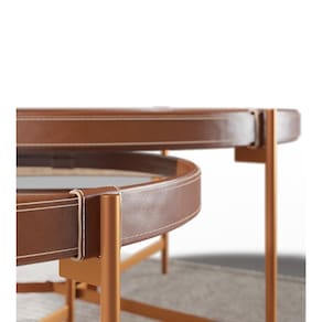 Mesa redonda revestida com material sintético de couro de alta qualidade;