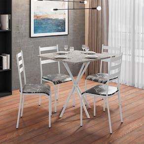 *Podem ocorrer variações de cores nos assentos das cadeiras e tampo das mesas em relação às fotos.* Medida da Mesa (A x L x P): 78 x 67 x 67 Peso da Mesa: 9 kg Mesa suporta até: 100 kg Acabamento da Cadeira/Banco: Pintura Epóxi Acabamento da Mesa: Pintura Epóxi Almofada do assento: Fixa Almofada do encosto: Não Possui Ambiente Principal: Cozinha Cadeira/Banco estofada: Somente Assento Estofado Cadeira/Banco Estofada: Somente Assento Estofado Cadeira/Banco suporta até: 100 kg codigo_ean: 7900288199218 Complexidade da Montagem: Baixa: pode ser montado por uma pessoa sozinha Configuração do Conjunto: Mesa com Cadeiras Cor: Branco/Preto Floral Cor da Base: Branco Cor das Cadeiras: Branco Cor do Produto: Branco/Preto Floral De Canto (Canto Alemão): Não Design da Base: Em X Escala de Brilho: Brilhante Espessura do Tampo: 15 mm Estrutura do Encosto: Aço Formato do Tampo: Quadrado Itens Inclusos: 1 Mesa, 4 Cadeiras, Kit Ferragens e Manual de Montagem Linha ou Coleção: Diamante Manual de Montagem e Instalação: https://product-hub-prd.madeiramadeira.com.br/385357336/documents/377b37c1-ad42-4f1c-8ca8-e485a6cbcc27309112265481753280893478.pdf Marca: MBM DECOR Material da Base da Mesa: Aço Material da Estrutura da Cadeira: Aço Material do Tampo: MDF/MDP Material Principal: Aço Material Principal das Cadeiras/Bancos: Aço Medida da Base (A x L x P): 77 x 43 x 43 Medida da Cadeira/Banco (A x L x P): 90 x 38 x 43 Medida do Tampo (L x C x E): 67 x 67 x 1,5 Mesa Dobrável: Não Mesa Extensível: Não Necessita Montagem: Sim Origem do Produto: Nacional Peso da Cadeira/Banco: 2,9 kg Possui Apoio para Braços: Não Possui Apoio Para os Pés: Não Possui Prateleiras: Não Possui Suporte Giratório: Não Possui Vidro: Não Quantidade de Cadeiras: 4 Quantidade de Lugares: 04 Recomendações de Uso, Manutenção e Limpeza: Limpar com pano úmido. Uso recomendado para adultos e áreas internas. Sistema de Montagem: Já vai com todos parafusos necessários. Necessíta chave Philips. Tipo de Assento: Fixo Tipo de Encosto: Fixo Marca: Não Informado
