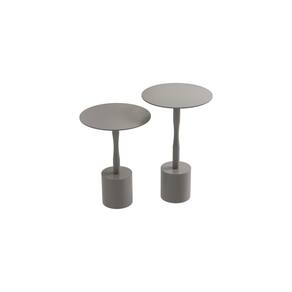 Composto por 02 mesas, tampos redondos, com borda invertida, base cilindrica fabricada com usinagem de alta precisão, haste em madeira maçiça,