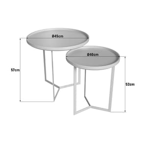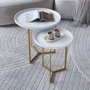 Composto por 02 mesas, tampos redondos, com borda, estrutura metalica em aço carbono na cor dourada.