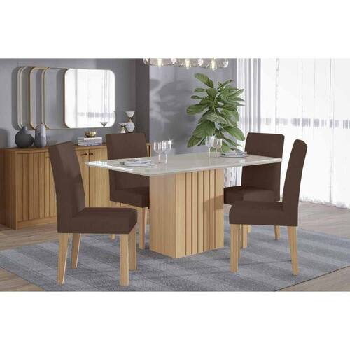 Conjunto: Mesa de Cozinha Ana Tampo Madeirado c/ Vidro 130x80cm e 4 Cadeiras Maia Nature/Off White - Nature/Suede Mascavo Chocolate - Cimol - Conjunto de Mesa de Cozinha com 4 Cadeiras