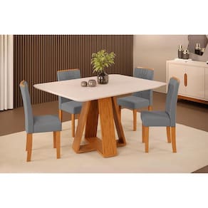 Sala de Jantar Completa Celeste c/ Tampo Madeirado c/ Vidro Curvo 120x90cm e 4 Cadeiras Zoe Freijo/Off White - Suede Lunar - DJ Móveis