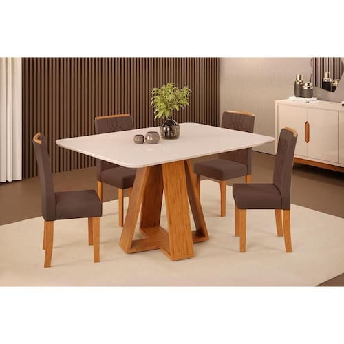 Sala de Jantar Completa Celeste c/ Tampo Madeirado c/ Vidro Curvo 120x90cm e 4 Cadeiras Zoe Freijo/Off White - Suede Moca - DJ Móveis