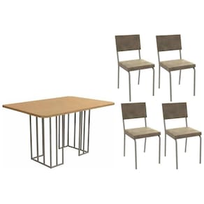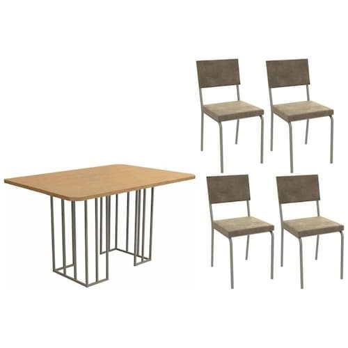 Conjunto: Mesa De Cozinha Duina C/ Tampo De Madeira 136cm E 4 Cadeiras Zaria Niquel/freijo - Suede Bege - Kappesberg