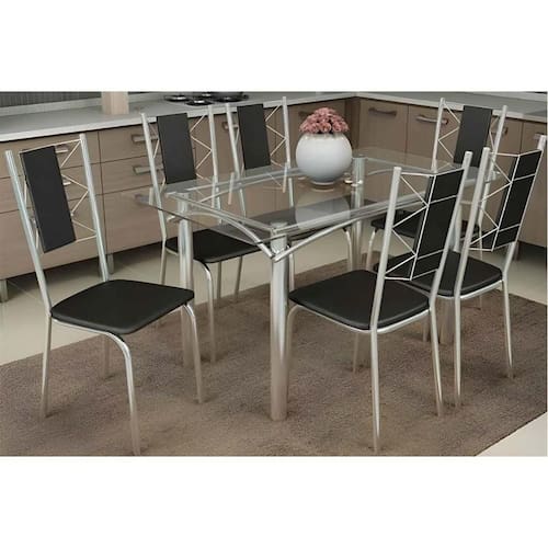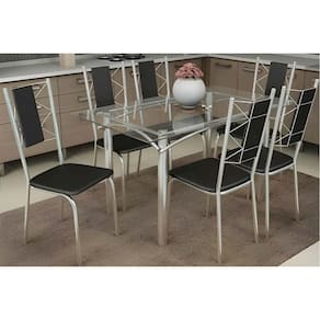 Sala de Jantar Completa Elba c/ Tampo de Vidro 120cm e 6 Cadeiras Lisboa Cromada - Courano Preto - Kappesberg Abaixo segue os produtos do KIT: Sala de Jantar Completa Elba c/ Tampo de Vidro 120cm e 6 Cadeiras Lisboa Cromada - Courano Preto - Kappesberg