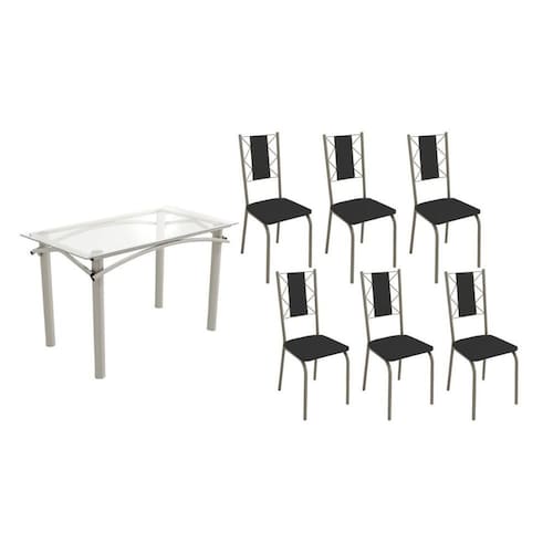Sala de Jantar Completa Elba c/ Tampo de Vidro 120cm e 6 Cadeiras Lisboa Niquel - Courano Preto - Kappesberg