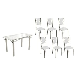 Sala de Jantar Completa Elba c/ Tampo de Vidro 150cm e 6 Cadeiras Lisboa Niquel - Courano Branco - Kappesberg Abaixo segue os produtos do KIT: Sala de Jantar Completa Elba c/ Tampo de Vidro 150cm e 6 Cadeiras Lisboa Niquel - Courano Branco - Kappesberg