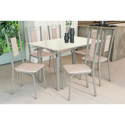 Sala de Jantar Completa Elba Tampo Madeirado c/ Vidro 120cm e 6 Cadeiras Florença Niquel/Off White - Courano Bege - Kappesberg Abaixo segue os produtos do KIT: Sala de Jantar Completa Elba Tampo Madeirado c/ Vidro 120cm e 6 Cadeiras Florença Niquel/Off White - Courano Bege - Kappesberg