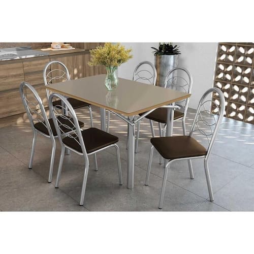 Sala de Jantar Completa Elba Tampo Madeirado c/ Vidro 120cm e 6 Cadeiras Holanda Cromada/Freijo Bronze - Courano Marrom - Kappesberg