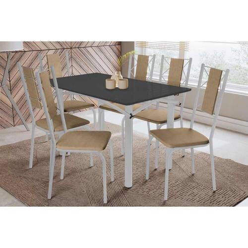 Sala de Jantar Completa Elba Tampo Madeirado c/ Vidro 120cm e 6 Cadeiras Lisboa Cromada/Preto - Courano Capuccino - Kappesberg