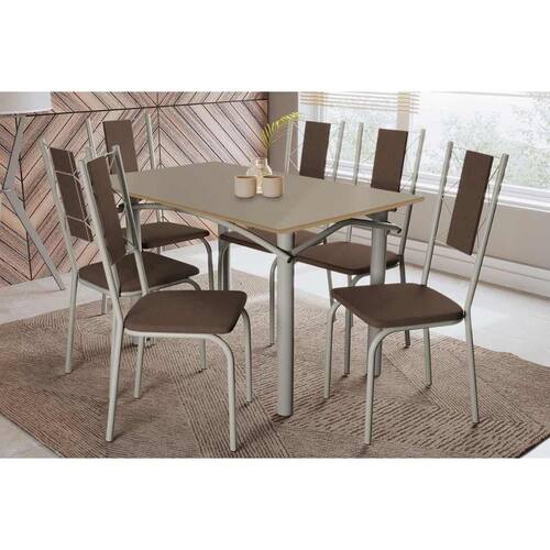 Sala de Jantar Completa Elba Tampo Madeirado c/ Vidro 120cm e 6 Cadeiras Lisboa Niquel/Freijo Bronze - Courano Marrom - Kappesberg