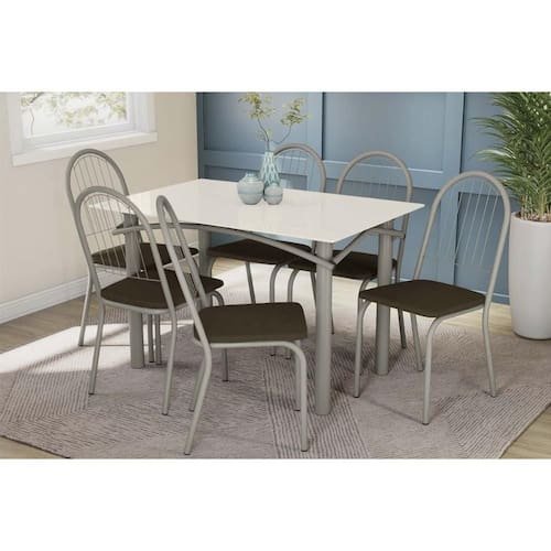 Sala de Jantar Completa Elba Tampo Madeirado c/ Vidro 120cm e 6 Cadeiras Noruega Niquel/Off White - Courano Marrom - Kappesberg