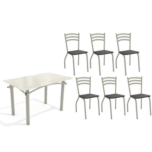 Sala de Jantar Completa Elba Tampo Madeirado c/ Vidro 120cm e 6 Cadeiras Portugal Niquel/Off White - Courano Preto - Kappesberg Abaixo segue os produtos do KIT: Sala de Jantar Completa Elba Tampo Madeirado c/ Vidro 120cm e 6 Cadeiras Portugal Niquel/Off White - Courano Preto - Kappesberg