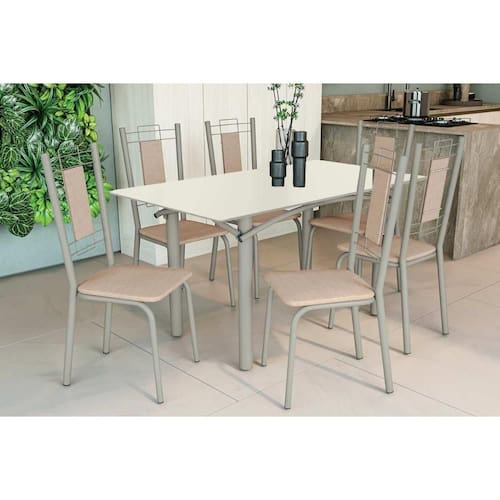 Sala de Jantar Completa Elba Tampo Madeirado c/ Vidro 160cm e 6 Cadeiras Florença Niquel/Off White - Courano Bege - Kappesberg