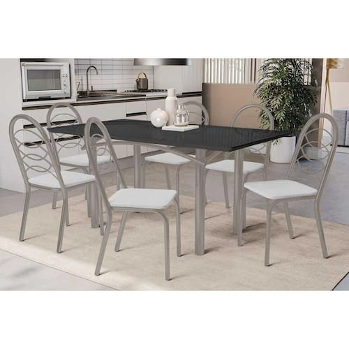 Sala de Jantar Completa Elba Tampo Madeirado c/ Vidro 160cm e 6 Cadeiras Holanda Niquel/Preto - Courano Branco - Kappesberg Abaixo segue os produtos do KIT: Sala de Jantar Completa Elba Tampo Madeirado c/ Vidro 160cm e 6 Cadeiras Holanda Niquel/Preto - Courano Branco - Kappesberg