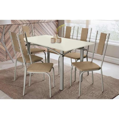 Sala de Jantar Completa Elba Tampo Madeirado c/ Vidro 160cm e 6 Cadeiras Lisboa Niquel/Off White - Courano Capuccino - Kappesberg Abaixo segue os produtos do KIT: Sala de Jantar Completa Elba Tampo Madeirado c/ Vidro 160cm e 6 Cadeiras Lisboa Niquel/Off White - Courano Capuccino - Kappesberg