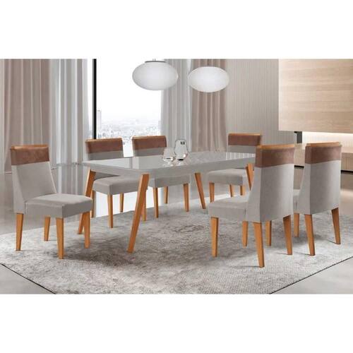 Sala de Jantar Completa Havana c/ Tampo Madeirado c/ Vidro Canto Curvo 180x90cm e 6 Cadeiras Jaspe Naturale/Off White - Suede Capuccino - Rufato Abaixo segue os produtos do KIT: Sala de Jantar Completa Havana c/ Tampo Madeirado c/ Vidro Canto Curvo 180x90cm e 6 Cadeiras Jaspe Naturale/Off White - Suede Capuccino - Rufato