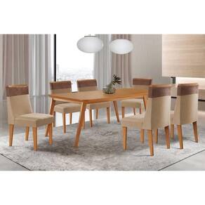 Sala de Jantar Completa Havana c/ Tampo Madeirado Canto Curvo 180x90cm e 6 Cadeiras Jaspe Naturale - Linho Bege - Rufato Abaixo segue os produtos do KIT: Sala de Jantar Completa Havana c/ Tampo Madeirado Canto Curvo 180x90cm e 6 Cadeiras Jaspe Naturale - Linho Bege - Rufato