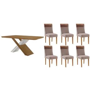 Conjunto: Mesa de Cozinha Imperatriz c/ Tampo Madeirado Canto Curvo 180x90cm e 6 Cadeiras Jaspe Naturale/Off White - Linho Capuccino - Rufato - Conjunto de Mesa de Cozinha com 6 Cadeiras