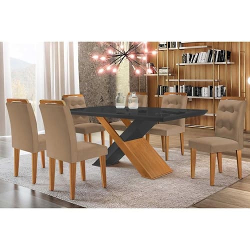 Conjunto: Mesa de Cozinha Imperatriz Tampo Madeirado c/ Vidro Curvo 180x90 e 6 Cadeiras Imperatriz Imbuia/Grafite - Suede Capuccino - Rufato - Blush