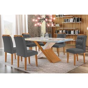 Conjunto: Mesa de Cozinha Imperatriz Tampo Madeirado c/ Vidro Curvo 180x90 e 6 Cadeiras Imperatriz Imbuia/Off White - Suede Grafite - Rufato - Blush