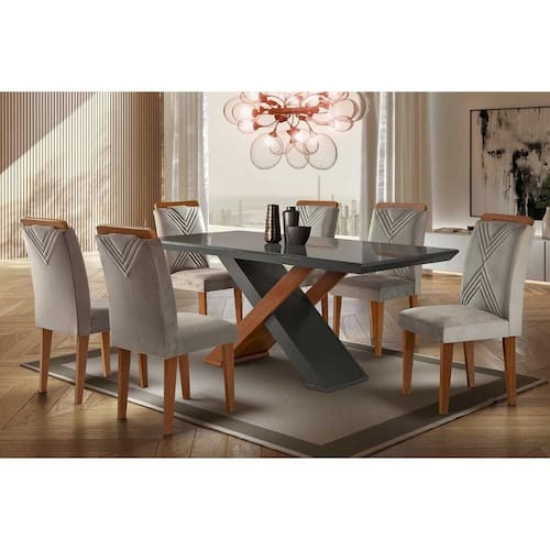 Conjunto: Mesa de Cozinha Imperatriz Tampo Madeirado c/ Vidro Reto 180x90 e 6 Cadeiras Amsterdã Imbuia/Grafite - Suede Creme - Rufato - Blush