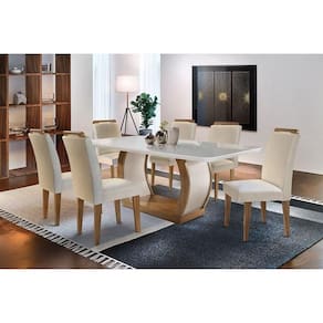 Sala de Jantar Completa Jade Tampo Madeirado c/ Vidro Canto Curvo 180x90cm e 6 Cadeiras Athenas Capuccino/Suede Creme - Rufato Abaixo segue os produtos do KIT: Sala de Jantar Completa Jade Tampo Madeirado c/ Vidro Canto Curvo 180x90cm e 6 Cadeiras Athenas Capuccino/Suede Creme - Rufato
