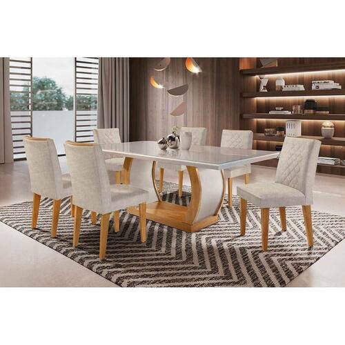 Sala de Jantar Completa Jade Tampo Madeirado c/ Vidro Canto Curvo 180x90cm e 6 Cadeiras Jade Capuccino/Suede Creme - Rufato