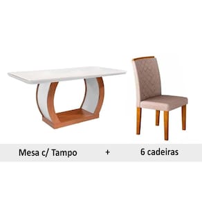 Conjunto: Mesa de Cozinha Jade Tampo Madeirado c/ Vidro Canto Reto 180x90cm e 6 Cadeiras Jade Imbuia/Off White - Suede Capuccino - Rufato - Blush