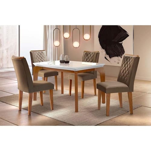 Sala de Jantar Completa Londrina c/ Tampo Madeirado c/ Vidro Canto Curvo 120x80cm e 4 cadeiras Jade Imbuia/Off White - Suede Capuccino - Rufato