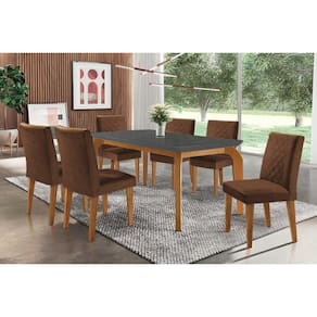 Conjunto: Mesa de Cozinha Londrina c/ Tampo Madeirado c/ Vidro Canto Curvo 180x90cm e 6 cadeiras Jade Imbuia/Grafite - Suede Marrom - Rufato - Blush